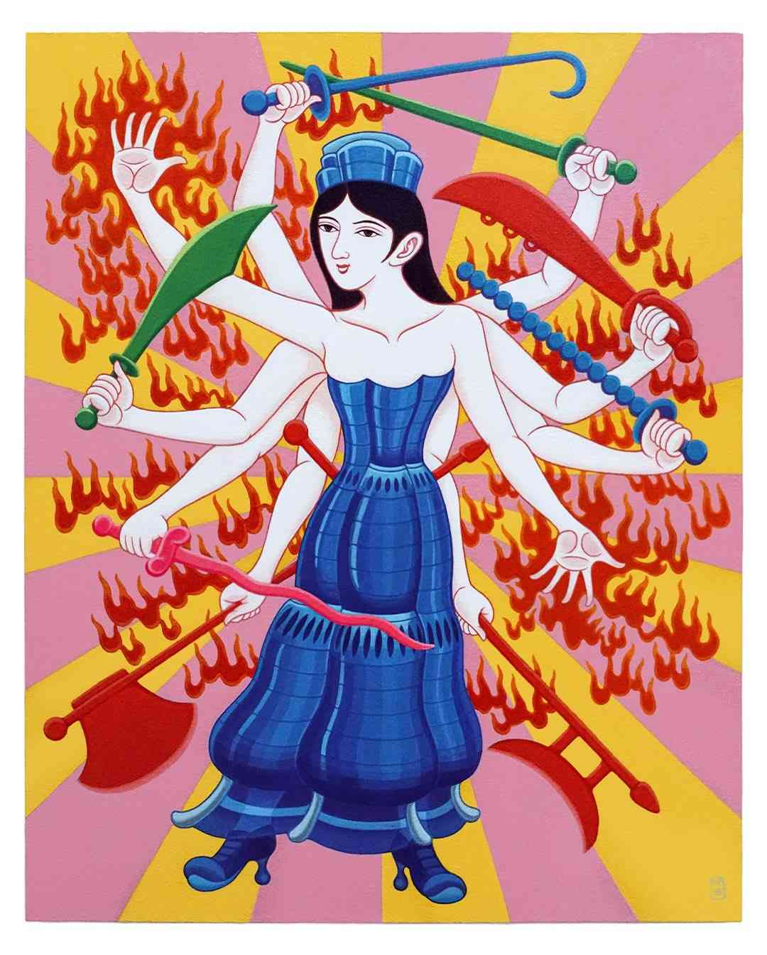 Shieh takes a fearless leap into new artistic territory. His once serene figures, symbolic of Hong Kong’s refined urban essence, now surge forward as armed warriors brandishing ancient weapons with commanding presence. Through exquisite brushstrokes and vivid hues, Shieh reinvigorates his celebrated fine brush painting technique, forging a stunning bridge between tradition and modernity.