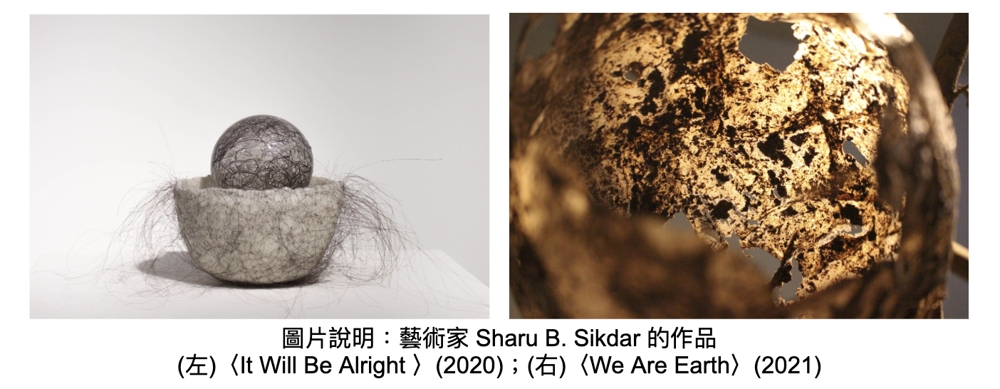 与地面装置相辅相成的是悬挂于墙上的艺术作品,由破碎的蛋壳和艺术家自身的头发精心缝合而成,反映 Sharu 在人际关系与情感的个人探索,探讨亲密关系、压力及在生活中无形设定的内心界限。透过作品中细致的修补与组合工艺,带出在决心和关怀下忘记所学与自我保护,亦是疗愈的一种过程。