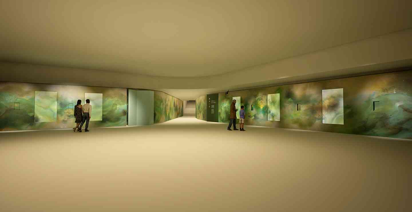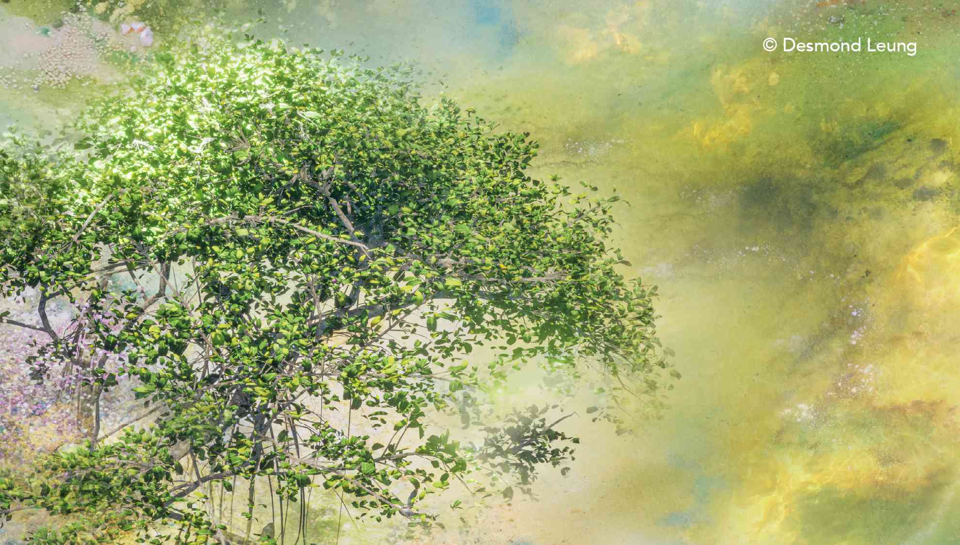 跨媒體藝術家梁嘉昊與監製羅皓文把東九展隅化作一隅綠洲:踏入這裏,在繁囂的城市核心感受自然的吐息——立體視覺動態偵測系統感應觀者的身影動作,轉化為數據,透過視覺編程即時計算,於屏幕上觸發由梁嘉昊以墨、礦物顏料和虛擬影像所創作的互動風景畫,以及由波多野裕介創作的音樂。影像亦隨日光與時間同步流轉。
