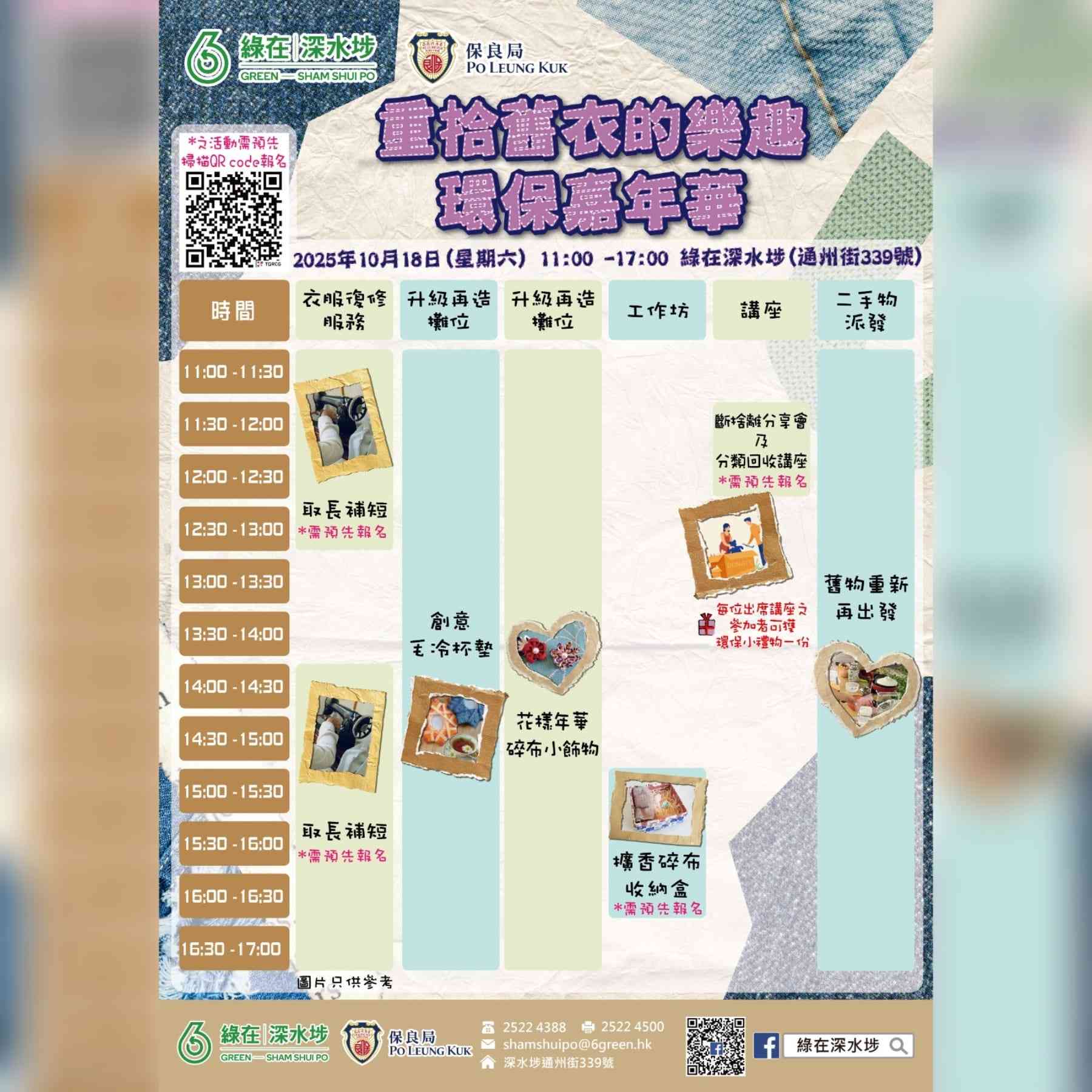 重拾舊衣的樂趣環保嘉年華是以舊衣服升級再造、重用及重新修補為主題;綠在深水埗將協助大家修改不合身的衣服,並利用舊布碎及用剩的毛冷升級再造,重新賦予它們一個新的生命,變成一件實用又美觀的環保產品,減少製造浪費;我們藉著講座教育大家分辨「需要」及「想要」,恰當地斷捨對物質的執著和渴求,學習正確的回收分類方法,鼓勵公眾積極從日常生活中實踐源頭減廢,培養可持續綠色生活習慣。
