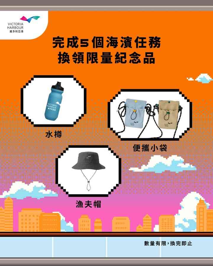挑戰五個好玩攤位遊戲, 集齊印仔,學識SHARE海濱使用攻略,即可換領精美紀念品(水樽、便携小袋、漁夫帽)一份!