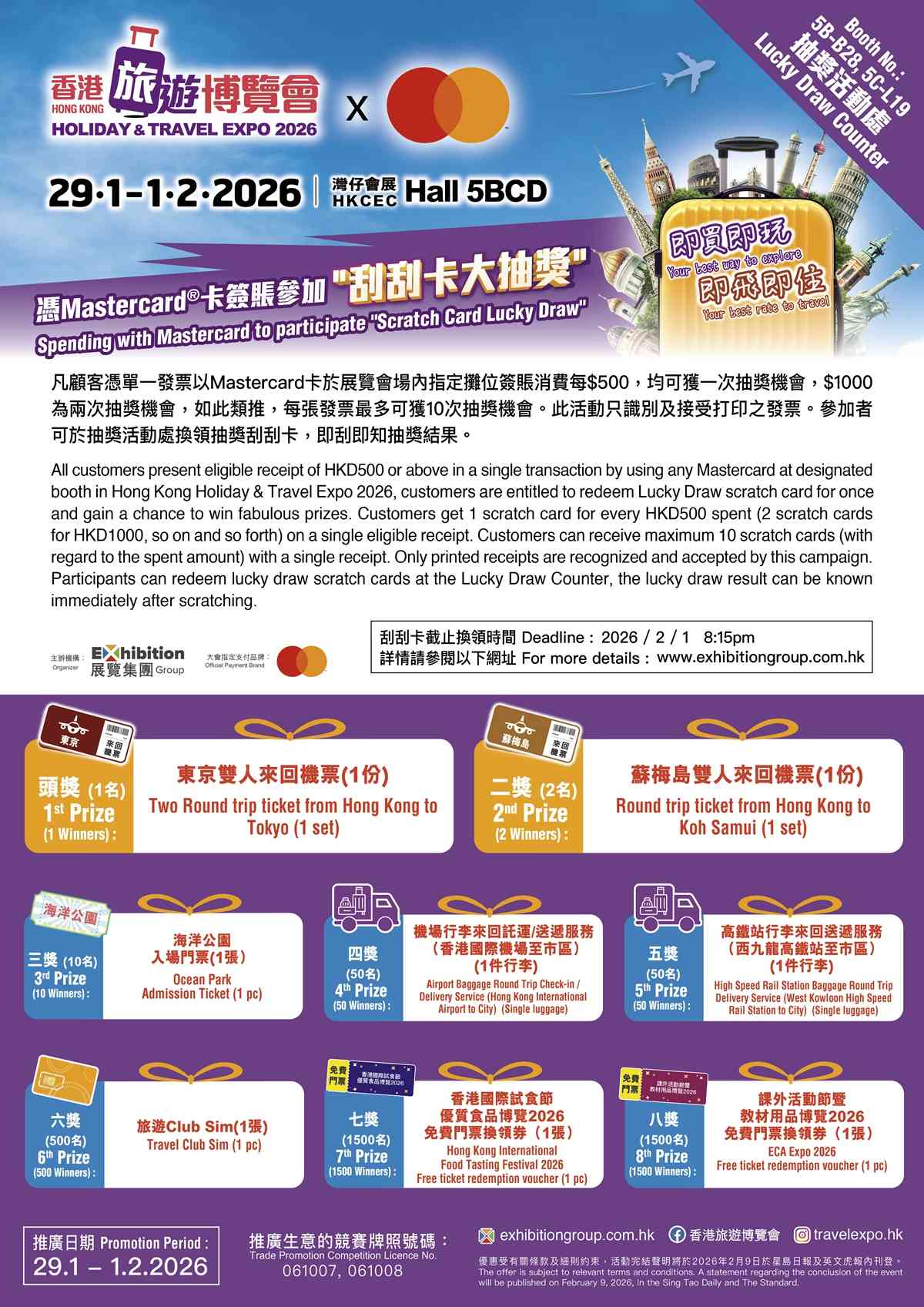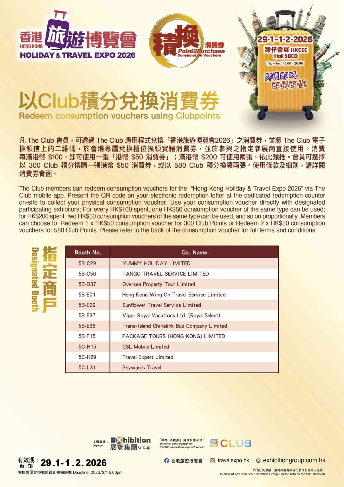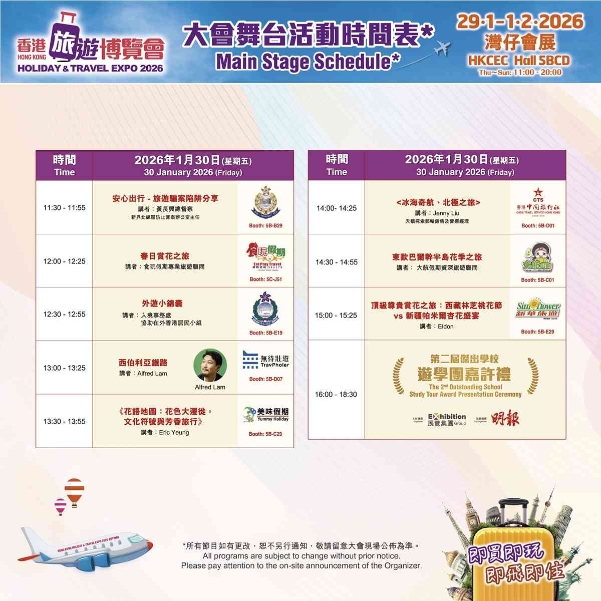 展覽集團自2024年起舉辦的「香港旅遊博覽會」及「香港秋季旅遊博覽會」屢創入場人次新高,廣受各界好評。展覽集團宣布「香港旅遊博覽會2026」將於2026年1月29日至2月1日假香港會議展覽中心展覽館5BCD載譽歸來,滿足廣大市民對廣大市民對一站式旅遊資訊及產品的殷切需求。