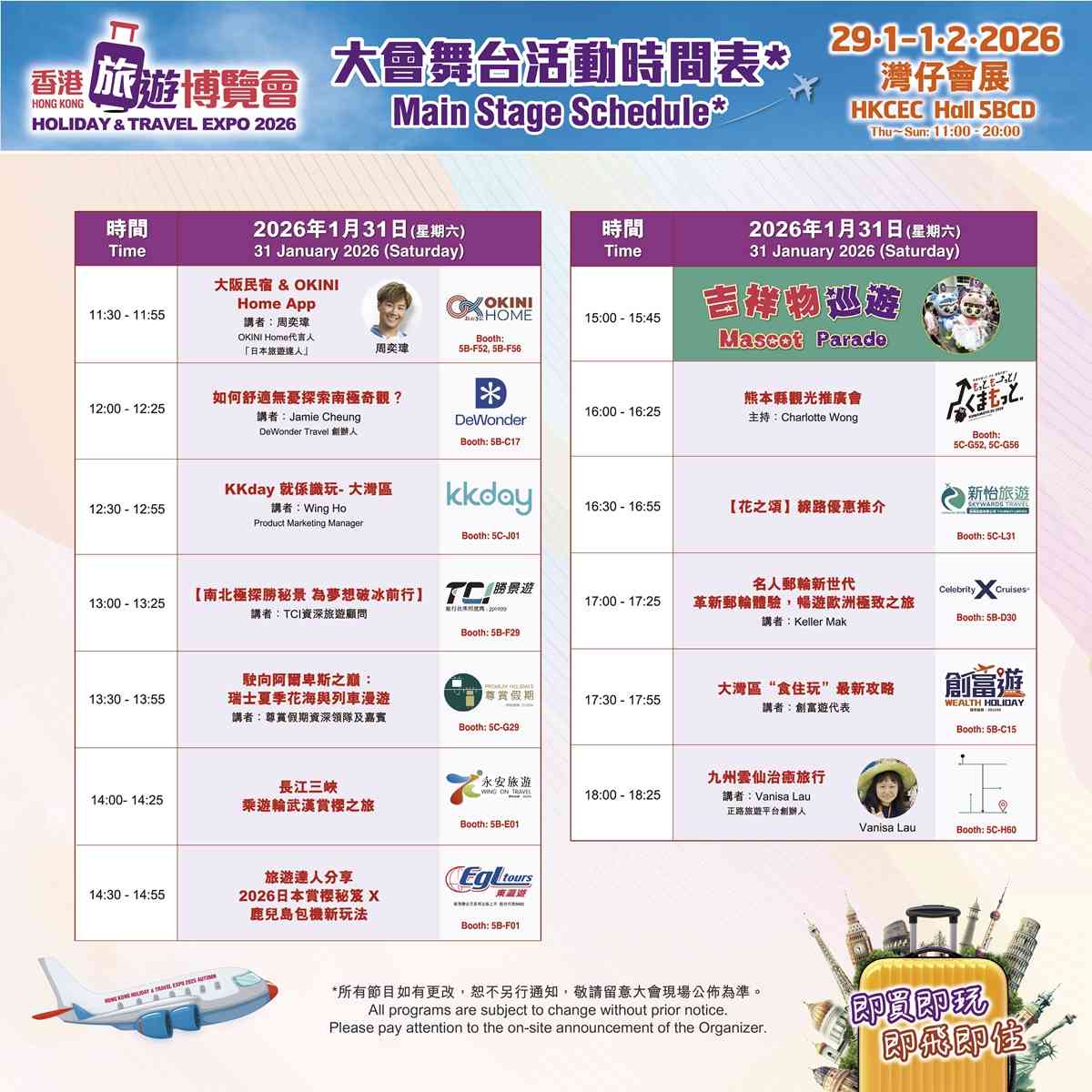 此外,大會將於1月31日及2月1日下午3時舉辦吉祥物巡遊,邀請多隻來自不同地區的吉祥物,包括︰防騙「提子」、1868大使「阿邦」、澳門特別行政區政府旅遊局的「麥麥」、鹿兒島「Greboo」及其他日本不同縣市的代表吉祥物、以及國際吉祥物聯合總會的多位成員 -「易易 Momo」、「諾諾」、「珠珠」、「健康博士」、「麥魚丸」等。參加者不僅可與它們互動合照,打卡留念,共創節慶歡樂氛圍。同時,大會亦將舉辦超過50場旅遊講座及表演,以及「遊學團探索區」,讓每位入場人士都能滿載而歸,盡享旅遊樂趣。