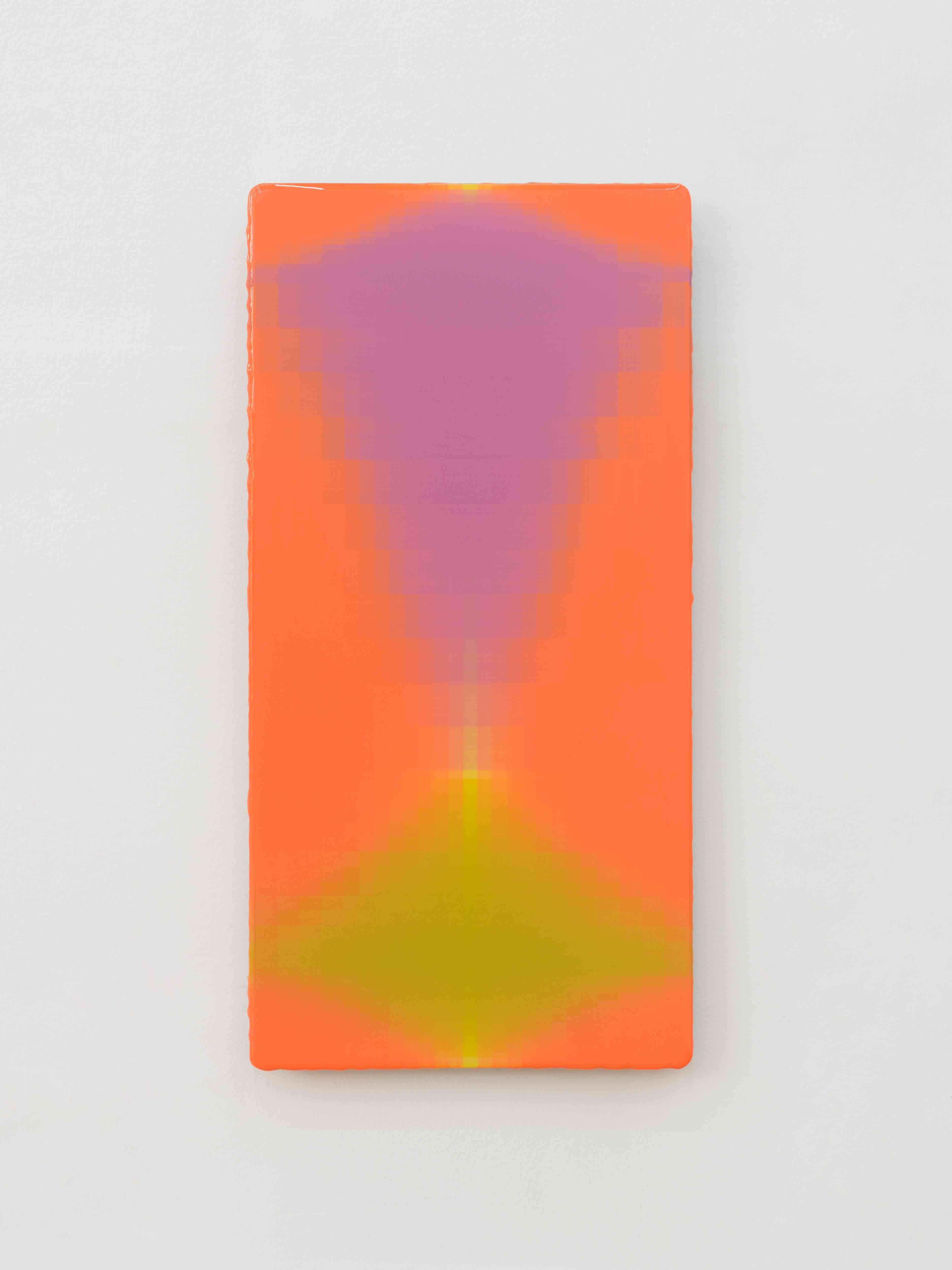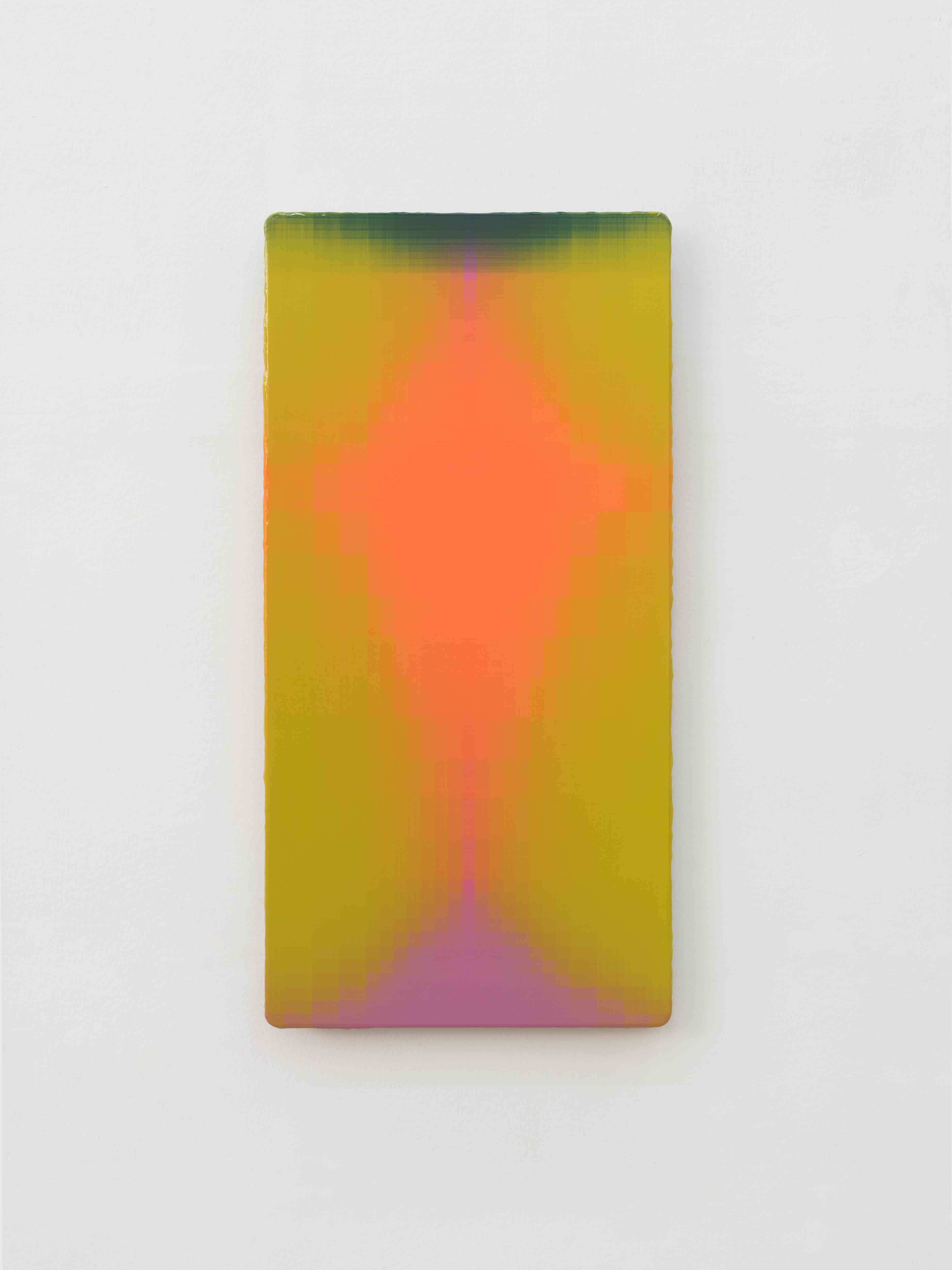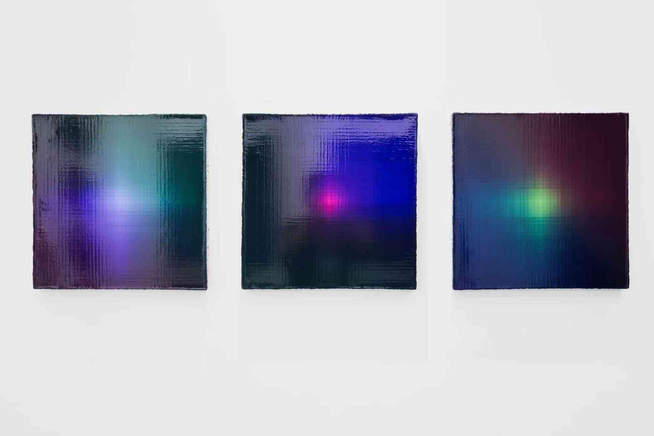 新作《一閃》則將這種關於「顯現瞬間」的思考推向另一種時間尺度。作品以高度壓縮的視覺能量回應香港這座城市經驗中短暫而強烈的光感記憶,使圖像如同在黑暗中短暫出現的亮度痕跡。藝術家選擇工業鋁板作為繪畫的基底,以源自西方古典油畫中「罩染法」技巧對於鋁板表面進行上百層的顏料疊加,卻最終與南宋古瓷釉面潤澤達成視覺上的統一。通過多層半透明顏料的反覆覆蓋與消解,圖像不斷偏離最初的形態,在生成與抹除之間保持微妙的平衡。光在此不再穩定存在,增添了一層不安或危險的隱喻,而更接近一種暫態出現又迅速消隱的事件。