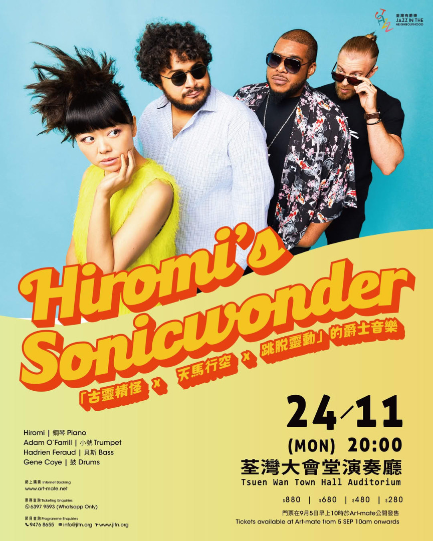 曾邀請Chris Botti、Diana Krall來港開show的「荃灣有爵樂」,11月將請來日本爵士鋼琴代表Hiromi (上原廣美),爆紅爵士樂漫畫《BLUE GIANT》電影版的音樂便是由她創作及監製,她的音樂集jazz、funk、pop、rock於一身。她亦是格林美獎、Boston Music Awards、Music Awards Japan得主,游刃有餘又能量爆滿的風格吸引大量香港樂迷。她和小號手Adam O'Farrill、貝斯手Hadrien Féraud、鼓手 Gene Coye,組成了jazz fusion quartet—— Hiromi's Sonicwonder,2023年出版專輯Sonicwonderland獲得好評,終於有機會欣賞他們現場演奏,聽聽他們怎樣打破爵士樂成規,再次體現爵士樂的自由精神。