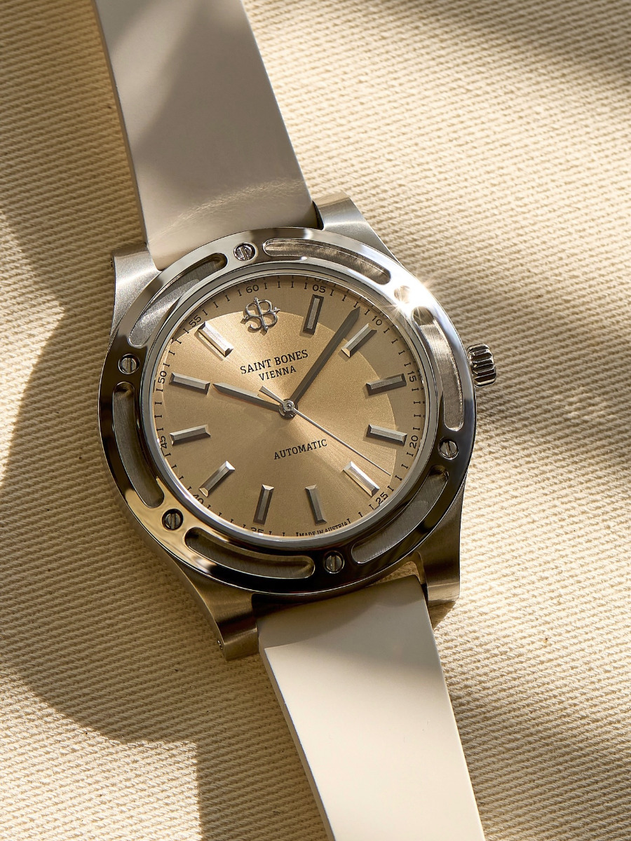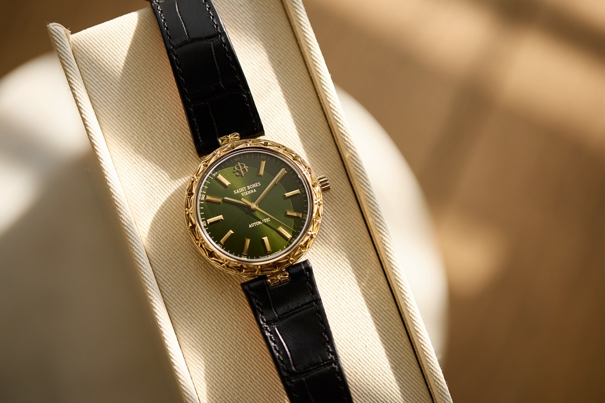 Leger在法文意指「輕盈」,Saint Bones以此為靈感,糅合精密⼯藝 、 建築線條與古典花飾之美,採用鏤空錶殼的結構設計,將鈦⾦屬的⾻架結構若隱若現,營造出層次分明的光影透視。 從錶圈⾄錶扣,每⼀處細節均呼應中世紀法式哥德建築的繁複花紋;錶⾯共有兩款 ⸺ 皇家綠放射紋錶⾯配立體時標以及幽靈灰(Fumé Grey)放射紋透明錶⾯,加上厚度僅 8.7 毫⽶,上手輕盈無比,絕對對得上「「輕奢」二字。