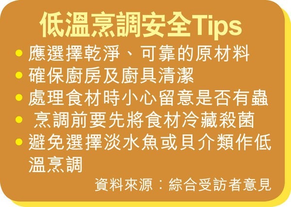 本港資深營養師黃榮俊解釋,低溫烹煮是透過溫度與時間結合,令食材變熟,亦是介乎烚與蒸煮之間的一種烹調方法,可令食物有更鮮更嫩的肉質及味道。惟低溫烹調法的煮溫不高,未必能徹底將食材中存在的致病菌或寄生蟲消滅。因肉類有致病菌或寄生蟲的機會較低,此烹調法常用於烹調或加工肉類,而以低溫烹調法處理海產類、魚類及豆類食品,有較高食安風險,如豆類有機會存有的抗營養素或毒素,未必能完全被消除。