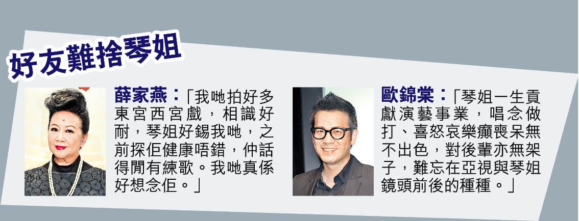 另外,胡楓(修哥)得悉相識半世紀的好友離世,修哥眼泛淚光稱︰「個心好唔舒服、好悲痛,一個一個唔喺到,尤其係阿琴,我識咗佢60年有多,阿炳(譚炳文)又係……咁樣真係唔知點講。阿琴同我合作時多數演一個喜歡我嘅人,佢真係好靚。」至於契女關菊英昨午則透過經理人公司回覆︰「收到消息都心情難過,真係無任何回應,多謝大家關心,希望佢嘅家人節哀。」