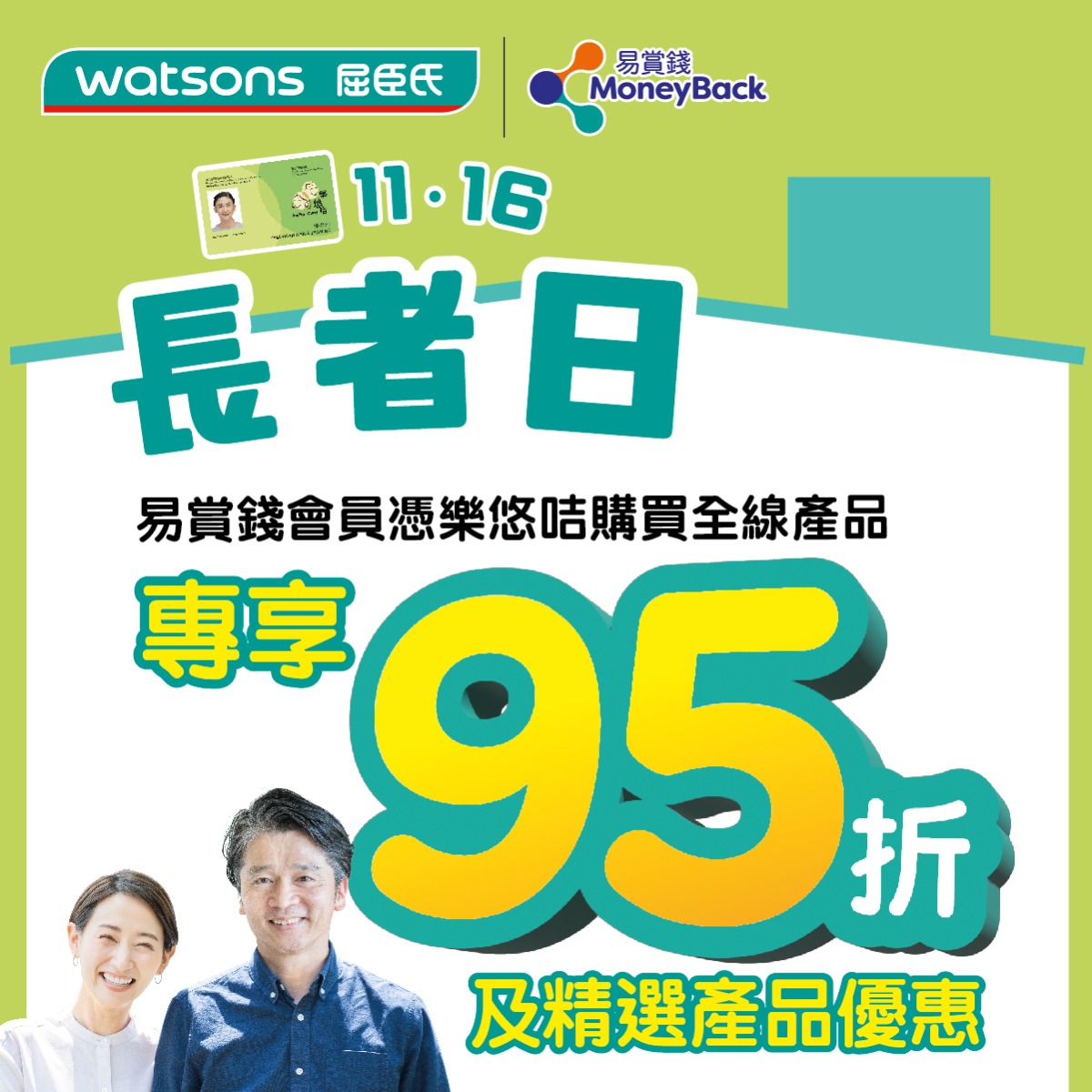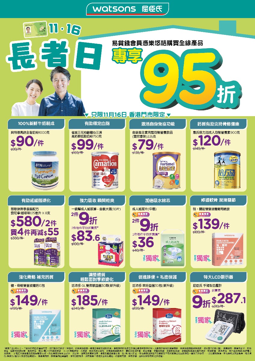 於11月16日,於屈臣氏購買任何產品專享95折。為特別針對長者的健康需要,精選多款健康產品包括營養奶粉、補充品、成人紙尿片及血壓計等,優惠更低至58折。(須為易賞錢會員並於門市綁定樂悠咭)