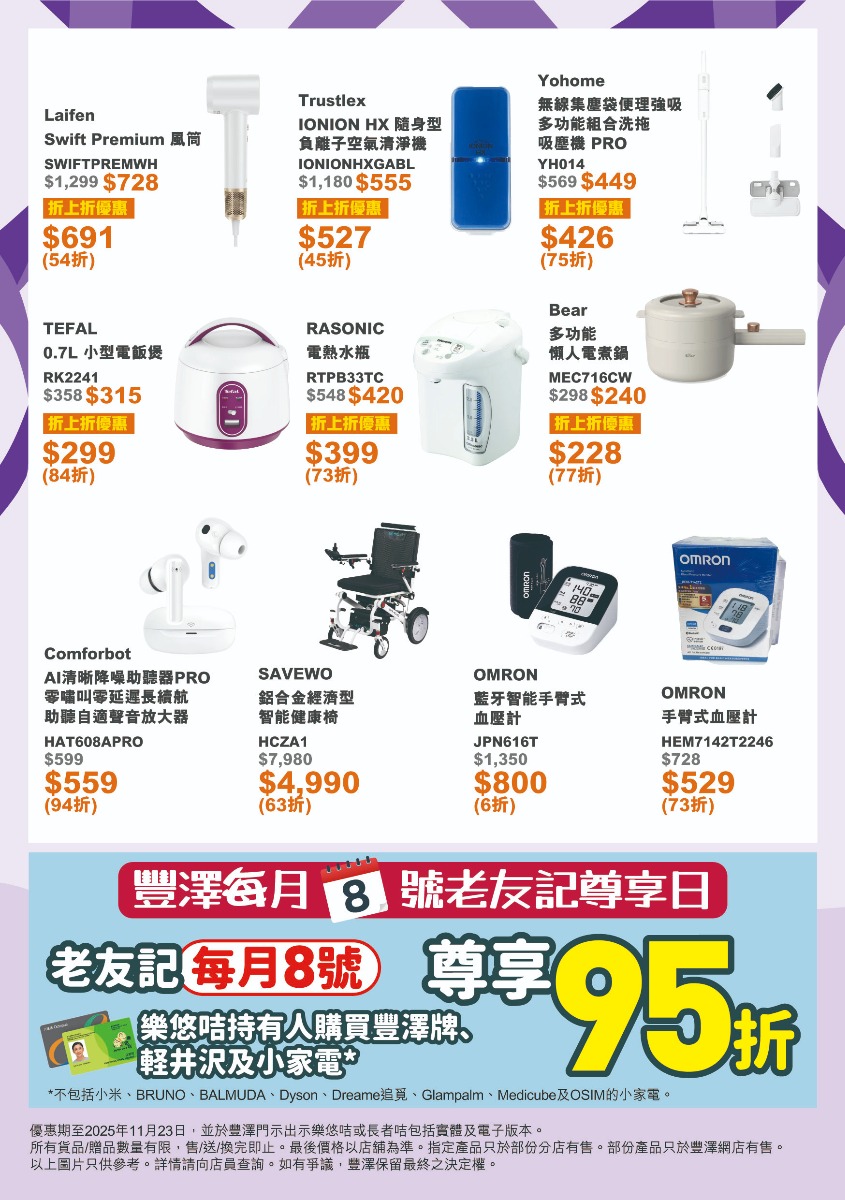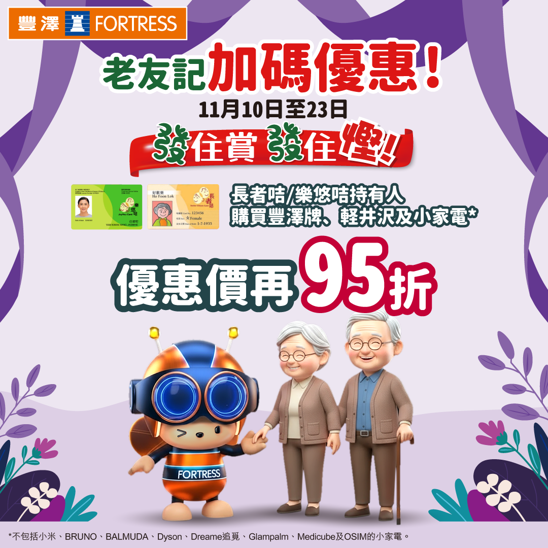 11月16日為「長者日」,百佳超級巿場、屈臣氏及豐澤,將為一眾老友記送上9折或95折的專屬優惠,涵蓋食品及生活用品、營養補充及健康產品以及電器,於屈臣氏購買精選健康產品,包括營養奶粉、補充品、成人紙尿片及血壓計等,優惠更低至58折!