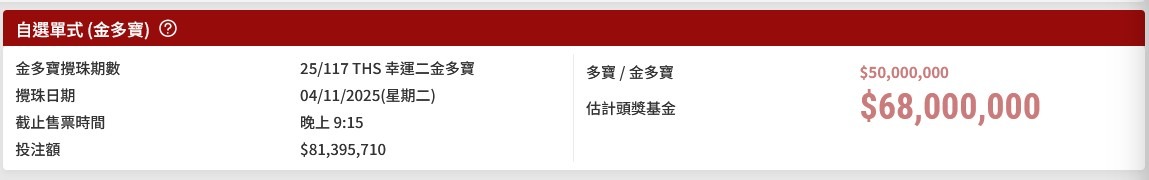 今年25/117 THS 幸運二金多寶將於11月4日星期二攪珠,預計多寶/金多寶$50,000,000,估計頭獎一注獨中達$68,000,000。留意截止售票時間為星期二晚上 9:15,大家要好好把握機會!
