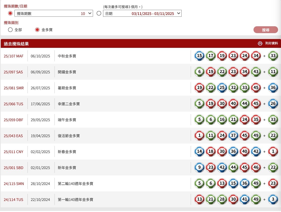 過去十期金多寶攪珠結果