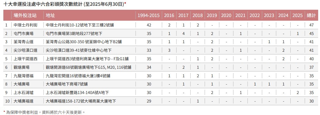 另外,賽馬會公佈2025上半年截止6 月30十大幸運投注處日中六合彩頭獎次數,暫時來說今年上水石湖墟投注站最旺,有兩次頭獎幸運兒,十大幸運投注處累計排第九。另外,屯門市廣場投注站於上半年亦有一位頭獎幸運兒在此購彩票,累積計穩佔十大幸運投注處第二位,歷年共有45次中頭獎幸運投注處次數!