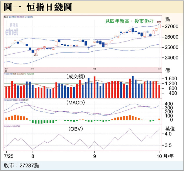 《金融界》報道,10月2日,港股高開高走,全天保持震盪向上走勢,截至收盤,恒生指數漲1.6%,報27287點。