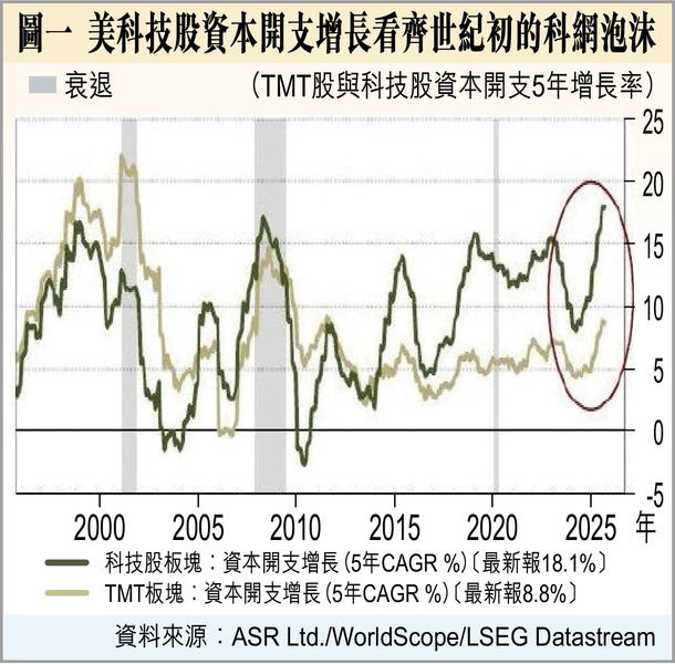 今時美科技股在資金投入的走勢跟1999至2000年的科網潮時的資金投入走勢極類似(圖一),投資者擔心又會否終來個爆破。