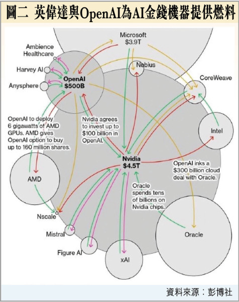 上周,Burry在社媒平台X上發布一則神秘貼文,內容為電影《大空頭》中以自己為原型的角色劇照,並配上一句警示:「有時候,我們看到泡沫。」他在周一晚上又發出一組圖片,其中包括彭博關於英偉達等公司參與「循環融資」的報道截圖(圖二)。