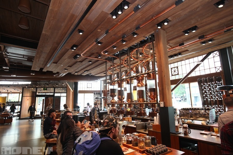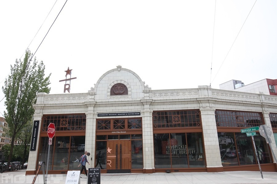 由位於海邊Pike Place Market的Starbucks創始店出發,沿著Pike Street走15分鐘,就會到達位處半山的Roastery。這是一座參照當地百年前建築風格的建築物,原址前身為Volvo展廳;1.5萬平方呎的店鋪,裝潢完全沒有Starbucks的影子,人魚招牌由綠色變成銅雕,只掛在正門外,而Roastery的標誌是古銅色的星星,加上英文字母「R」。