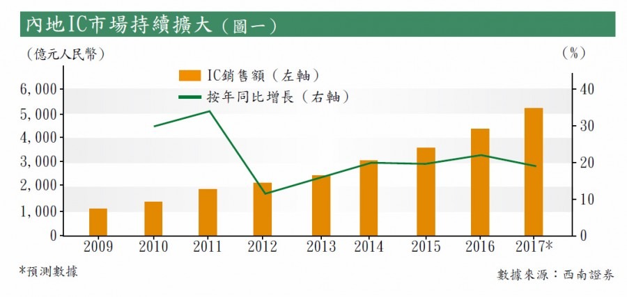內地半導體有近八成用於集成電路(IC)的相關領域,自2013年開始中央就十分關注IC作為信息技術的核心,不論從經濟或國家安全的角度,都致力讓國產IC能與國際水平看齊。中國在去年進口2,271億美元IC、出口為614億美元,不單佔全球進口逾半,同時亦是IC貿易逆差最大的國家。換言之,只要中國IC的水平與國際差距愈來愈少,那麼內需已經足以支持其發展。