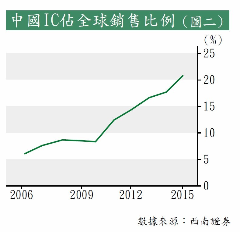 實際上,近年內地本土IC的增長相當不錯,自2012年以來,年均增速仍達近兩成(見圖一),而中國製造IC佔全球銷售的比例亦逐步上升(見圖二)。當然,過去表現不代表未來,不過IC的下游主要用家包括電腦、網絡通信及消費電子,三者佔比達八成,而且均屬於新經濟行業,短期內行業發展轉向的機會甚微,隨著人工智能、5G通信、智能手機等發展,IC的需求應有保障。