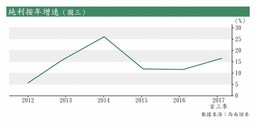 集團首三季公司收入仍然維持高增長,按年升49.3%,較2016年全年增速33%有所加快。作為全國半導體產業鏈的上游核心,相信有望續受惠於中央的半導體政策。盡管技術水平仍有所不及,但差距正在減少。由於入行門檻極高、政策優惠以及市場需求旺盛,西南證券預計集團半導體設備業務的毛利率,未來3年將維持在四成的水平。