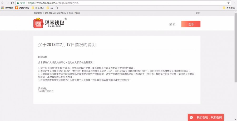 7月13日爆雷的「貝米錢包」已在官網貼出告示: 暫無兌付計劃 (貝米錢包官網截圖)