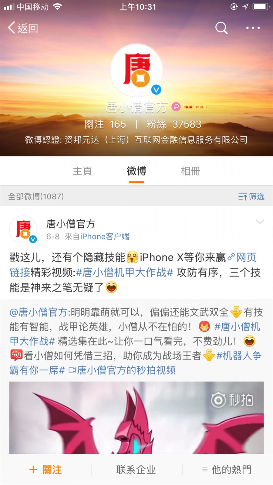 端午節爆雷的「唐小僧」微博更新停留在6月8日,其官網已無法打開 (微博截圖)