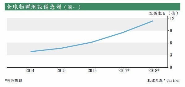 Gartner的研究指去年全球物聯網設備數量達到84億,已超過全球人口數(見圖一),到2020年更會增至204億。然而,去年開始物聯網面對各種惡意軟件的攻擊,受襲個案數字按年增加近3倍,到2020年,預計有25%的網絡攻擊將與物聯網有關,因此預計今年全球用於物聯網信息安全市場的投資達到15.1億美元,至2021年將急增至31.2億美元(見圖二),市場空間龐大。