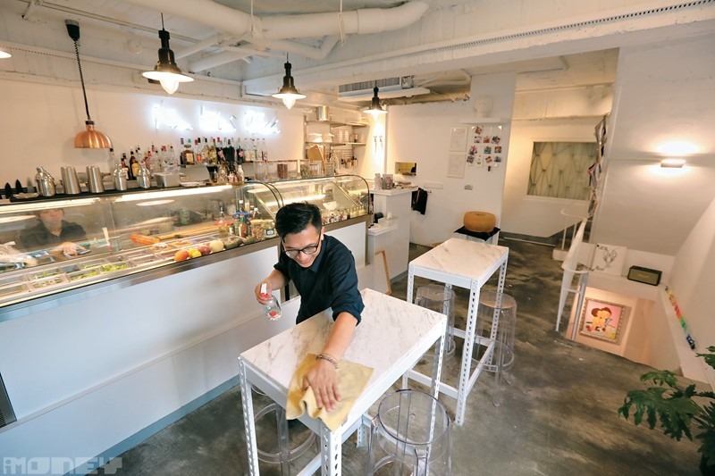 80後港人阿東(江東源)的畫廊餐廳「沐。微菜」位於台中市北區小商區的一條隱蔽小巷內,記者找了近10分鐘才找到門口,是名乎其實的隱世小店。白色小店共有三層,店面一層是廚房及用餐區,下層是畫廊及另一個用餐區,樓上是洗手間,三層逾千呎。老實說,以香港人盡用每吋地方做生意的角度,這裏擺滿枱椅至少可坐40、50人,但阿東的枱椅放得少,疏落得讓人覺得有點「空盪」,更離譜的是還要「趕客走」,「剛才午市來了二三十個客,下層坐咗十個,店面又有十多個,有客仲話要入來,我話唔接喇。」