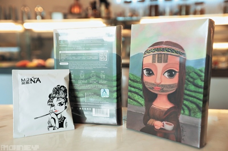 阿東的畫作被台灣面膜商邀請合作做包裝,左邊白色小包是阿東自家咖啡品牌,同樣以自己畫作做包裝。