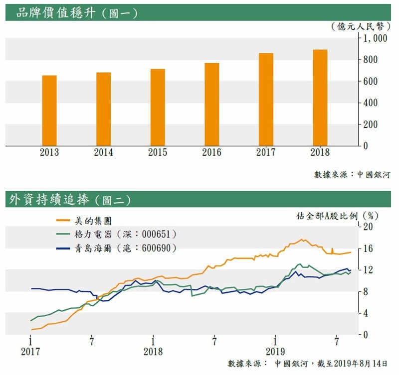 買電器好多時都是買品牌,集團一直走多品牌戰略,旗下超過10個國內外知名品牌,包括自家美的、獲品牌授權的東芝Toshiba等等,逐步建立其品牌王國。去年《2018胡潤品牌榜》,美的連續4年位居胡潤品牌榜家電企業第一位,其品牌價值連年遞升(見圖一)。依靠其品牌效應,集團首季業績,收入按年增長7.6%,淨利潤按年增長16.6%。集團2017年海外收入激增,主要是品牌成功打入東南亞等地。去年仍有超過四成收入來自海外,較2017年略增,未有太受中美貿易戰影響。