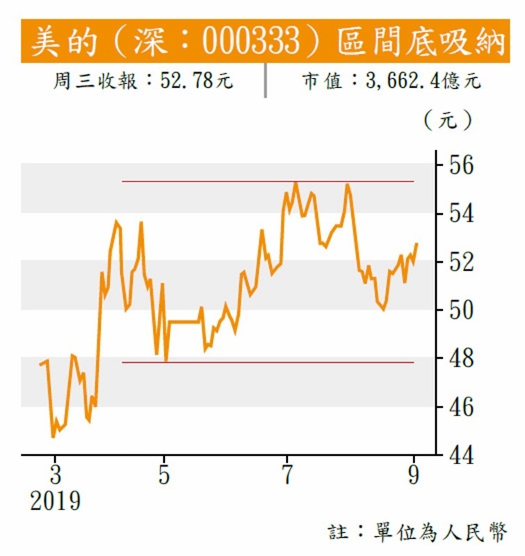 今年以來,集團一直保持升勢,去到3月之後股價開始區間橫行。預料今次家電政策可誘使更多買家轉向高端產品,加上集團上半年在行業受壓下仍能保持增長,其品牌價值亦可取,不妨於區間底部約48元人民幣買入,上望60元人民幣,跌穿心理位40元人民幣止蝕。