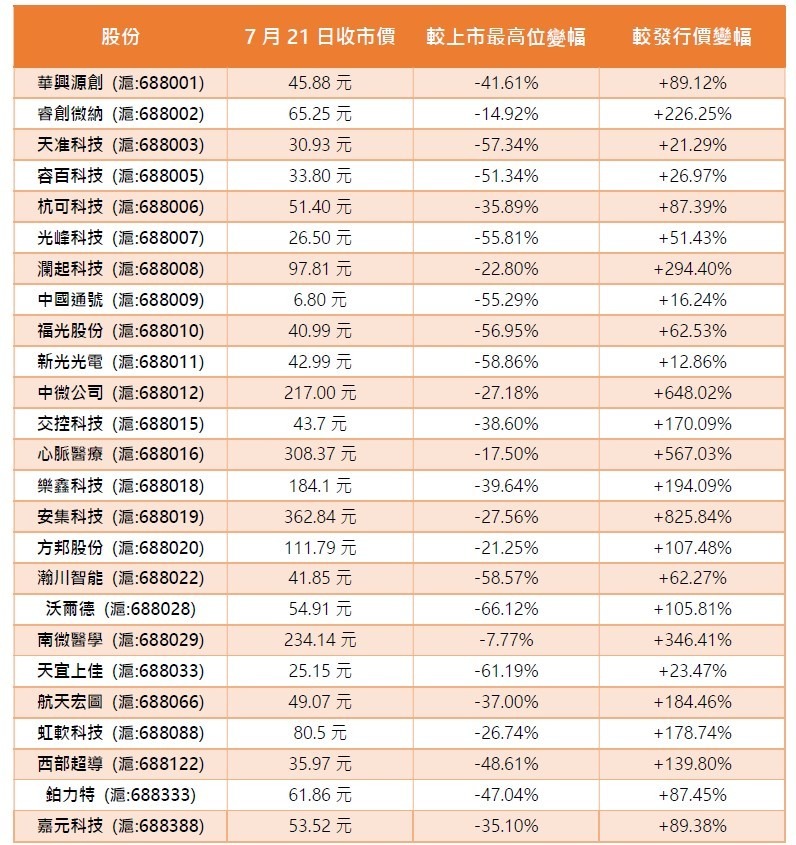 首批25隻科創板新股,截至周二(21日)上市剛滿一年,《經濟通通訊社》整合了該批股份的股價走勢,作為反映科創板賺錢能力的首份成績表。