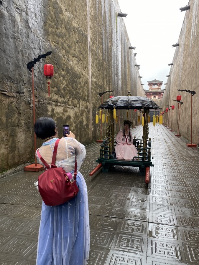 遊客身穿古裝漢服在遊覽秦王宮,實現從漢朝穿越到秦朝(黃燕明攝)