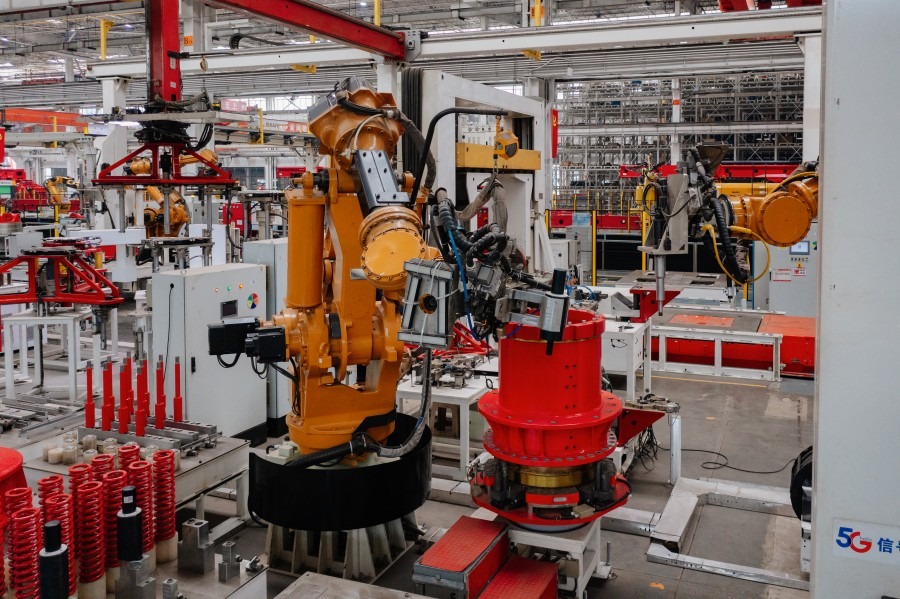 各種各樣的黃色機械臂彷如「鋼鐵俠」在空中翻轉下降、紅色的物流機器人靈活便捷地在固定的路線上來回移動,大部分生產線間只有一兩名工程師,一邊操作按鈕,一邊注視在機械人的工作進度。一些比較大型的部件,由鑽桿焊接機器人自動作業,但一些小的部件焊接還是由幾名工人來操作,機器人並不能完全取代人工。