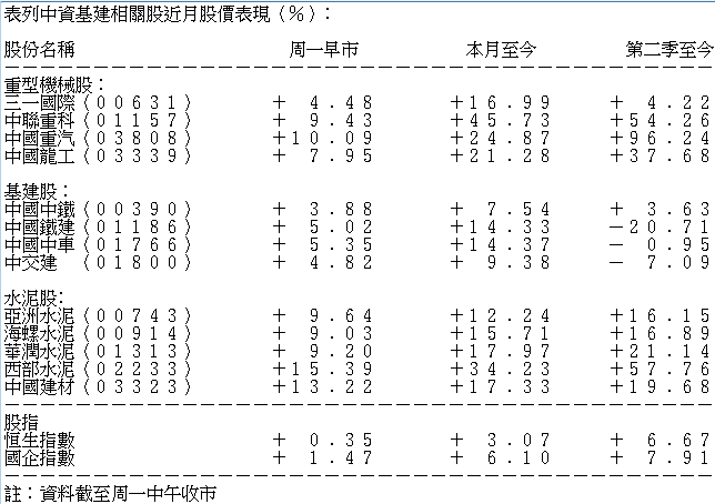 內地洪災持續,據《新華社》報道,中共中央政治局常務委員會上周五(17日)會議中提出,要全面提高災害防禦能力,將防災等重大工程建設納入第十四個五年規劃(「十四五」)統籌考慮,基建及重型機械股急升。另外,憧憬下半年水泥價格反彈,水泥股亦顯著造好。