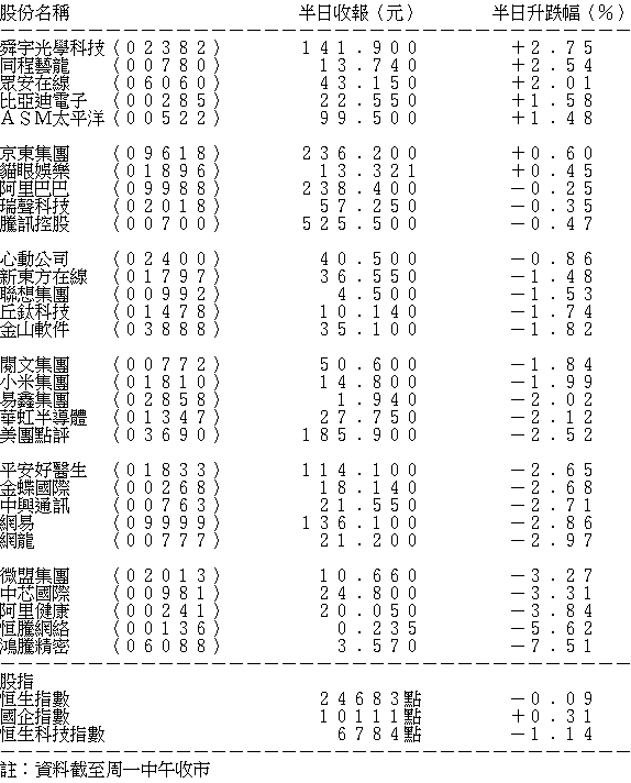 恒生科技指數跑輸大市 30隻成分股半日僅7隻上升