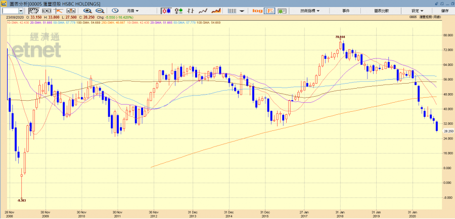 匯控(00005)2009年3月2日宣布「世紀供股」,供股價28元,3月9日收市競價時段見過33元「海嘯價」後已逐漸回升。沒想到逾11年後的今日,2020年9月23日,匯控股價不單打回原形,更要跌穿「世紀供股價」28元,相信「匯控跌穿世紀供股價」一組詞,將於今明兩日的媒體上廣泛報道。不過,不排除中間需加插一個「曾」字,難道已有資金入市博反彈?