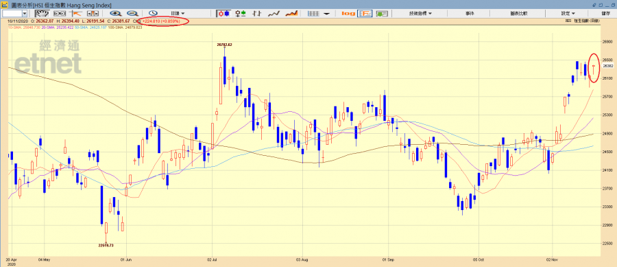 恒生指數收報26381,升224點或升0.86%。(經濟通HV2系統截圖)