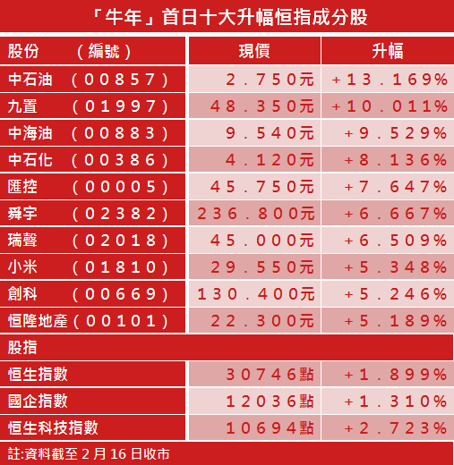 由於疫苗接種料重振油需,且產油國控制供應,油價周一微揚。布油期貨漲1.39%報每桶63.30美元,盤中曾觸近13個月高位每桶63.76美元,油市上周累漲5%。「三桶油」今日領跑恒指,中石油(00857)升13.17%,報2.75元,為升幅最大恒指成分股;中海油(00883)升9.53%,報9.54元;中石化(00386)升8.14%,報4.12元。而油服股方面,中海油服(02883)升10.46%,報10.88元;中石化冠德(00934)升3.81%,報3元。