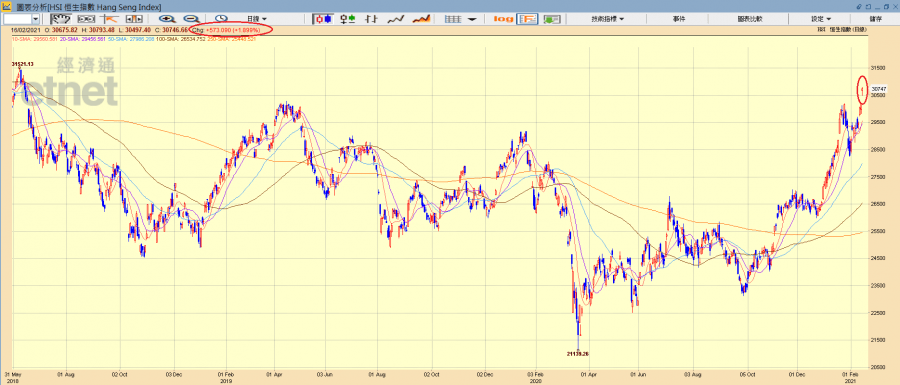 港股收報30746點,升573點或升1.90%。(經濟通HV2系統截圖)