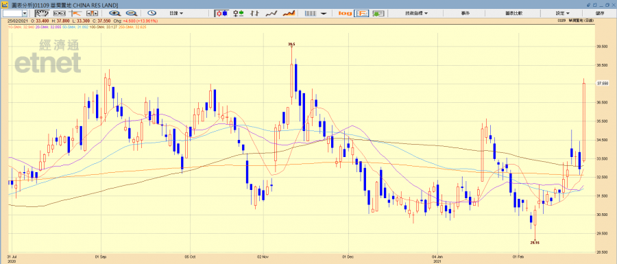 內房股走勢落後多時,受累於中央針對房企融資設立「三條紅線」,包括剔除預收款後的資產負債率不得大於70%、淨負債率不得大於100%,以及現金短債比不小於1倍。然而,弱勢股仍有翻身的一天,內房股今早全面大幅反彈,動輒上升一成,有媒體報道稱,中國多地宣布對住宅土地集中供應,實行重大土地供應改革。三大內房藍籌今早進佔最大升幅恆指成分股,潤地(01109)?11.99%,報36.9元;中海外(00688)漲10.13%,報20.55元;碧桂園(02007)走高8.47%,報9.99元。其他內房股亦大幅反彈,世茂(00813)報25.7元升13.47%;金茂(00817)半日收3.35元,升9.12%;龍湖(00960)報45.5元漲7.69%。