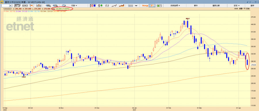 美團今日受上述兩大因素影響,以今日收市價計已連跌三日,累計跌幅14%。美團股價由今年2月創出歷史高位460元起計,至今日最低位274.2元,由高位累計跌幅達四成,短中線是迎來明顯反彈,抑或繼續尋底,視乎內地整改政策發展,以及美團主要股東是否有所行動而定。