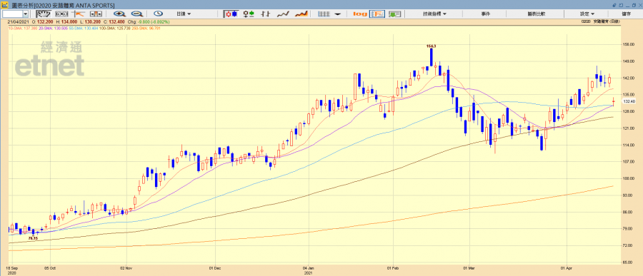 安踏體育(02020)走勢圖(經濟通HV2系統截圖)