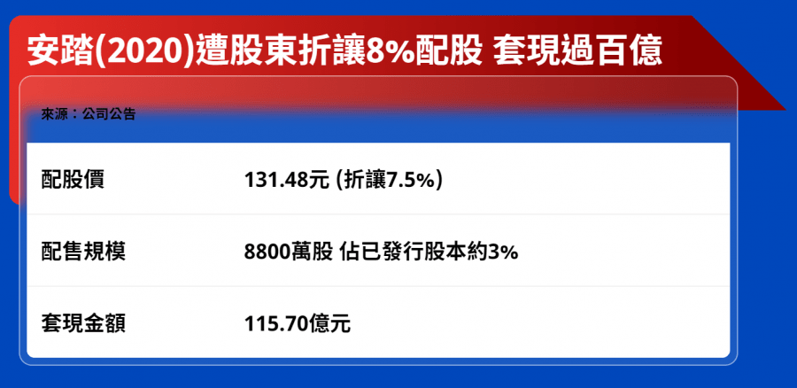 安踏體育今早公布,控股股東安踏國際集團控股配售8800萬股,每股作價131.48元,較上日收市價折讓7.54%,佔已發行股份約3.26%,套現115.7億元。而安踏國際由安踏體育主席、首席執行官及控股股東丁世忠、執行董事及控股股東丁世家及吳永華、非執行董事及控股股東王文默、執行董事及首席財務官賴世賢的配偶丁雅麗及其他股東共同擁有。