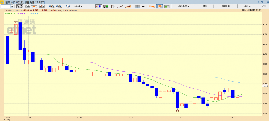 順豐房託(02191)五分鐘走勢圖。(經濟通HV2系統截圖)