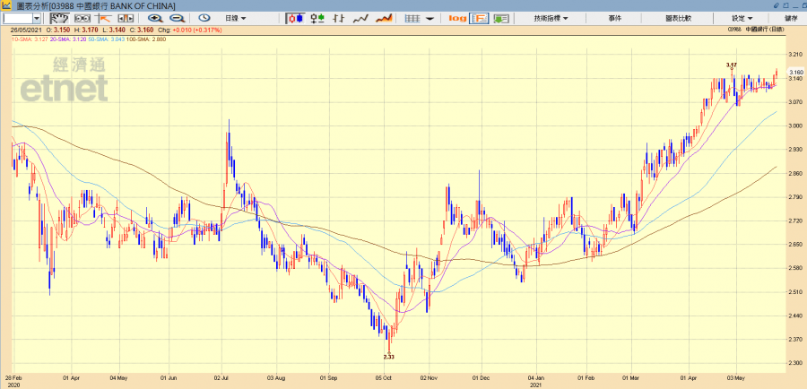 有市場分析指出,內銀股股價一般在其除息日前幾天相對有較好的表現,可能是由於部分投資者為了獲得股息,在除息日前一段時間買入內銀股。惟以中行為例,本周以來股價累升1.661%,比同期恆指升幅2.32%明顯為低,亦比起7月初才除息的建行(00939)其內升幅2.76%為遜色。可見股價升跌無譜跟隨,過往表現只作參考。
