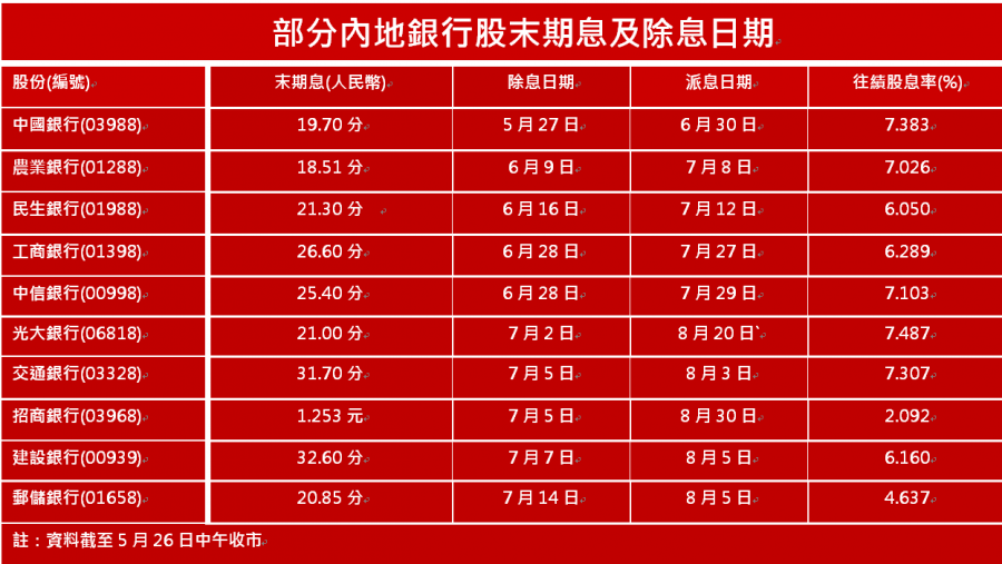 內銀股一年派息一次,股息率往往高達5%,吸引一眾食息一族。投資者要留意,除息日買入有關股份不能收到當期股息,除息日之前買入才可收息。以中行為例,投資者今日(26日)或之前買入並持股至除息日才可獲取當期股息19.7分人幣,惟股息要6月30日才會派發。