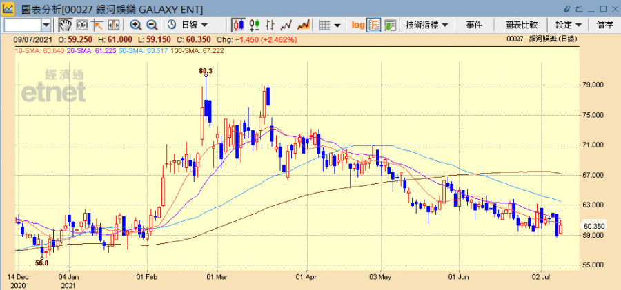 另外,澳門博彩監察協調局早前公布,今年6月份博彩毛收入為65.35億元(澳門元 ‧ 下同),創今年單月新低,按月大跌37.43%,但按年急升8.12倍,反映去年同期新冠肺炎疫情嚴峻,令去年同期基數較低,今年則漸露曙光。總結上半年,澳門累計賭收為490.23億元,按年升45.4%,但較疫情前的2019年同期低67.2%。