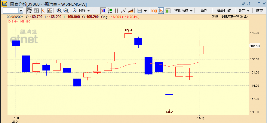 小鵬半日升10.72%報165.20元,重上上市價。(經濟通HV2系統截圖)