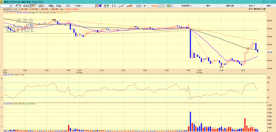 騰訊5分鐘圖股價走勢。(經濟通HV2系統截圖)